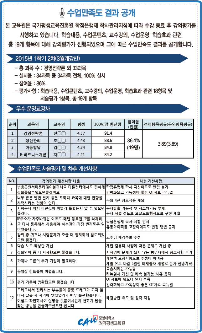 강의평가 결과를 반영하여 미흡한 부분을 개선하여 향후 수업만족도 향상을 위해 노력하겠습니다.