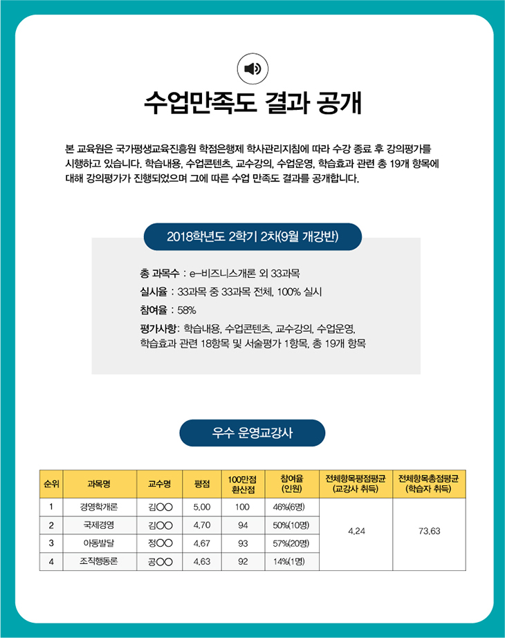 학점은행제 학사관리지침에 따라 수강 종료 후 강의평가를 시행하여 결과를 학습자님에게 공개합니다.