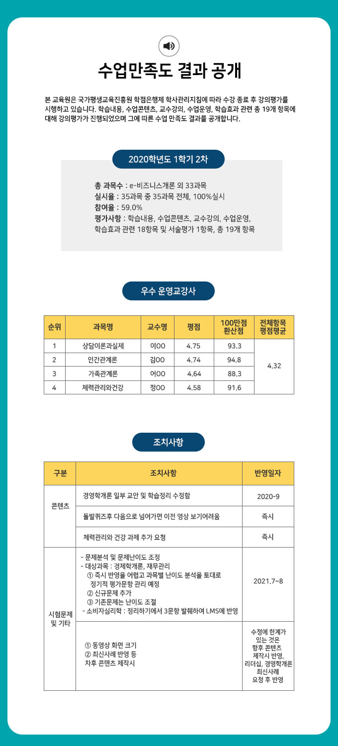 학점은행제 학사관리지침에 따라 수강 종료 후 강의평가를 시행하여 결과를 학습자님에게 공개합니다.