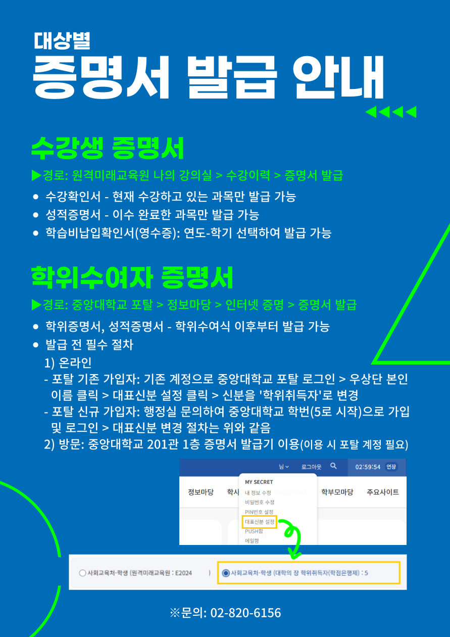 대상자별 증명서 발급 안내(수강생/학위수여자)