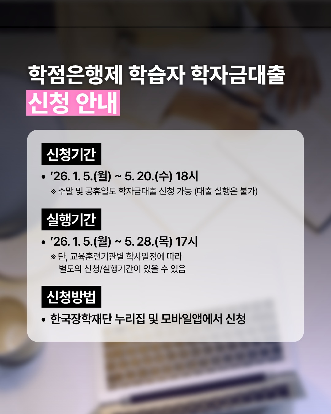 2026학년도 1학기 학점은행제 학습자 학자금대출 관련하여 아래와 같이 안내드리오니, 희망자는 확인하시어 신청 부탁드리겠습니다.